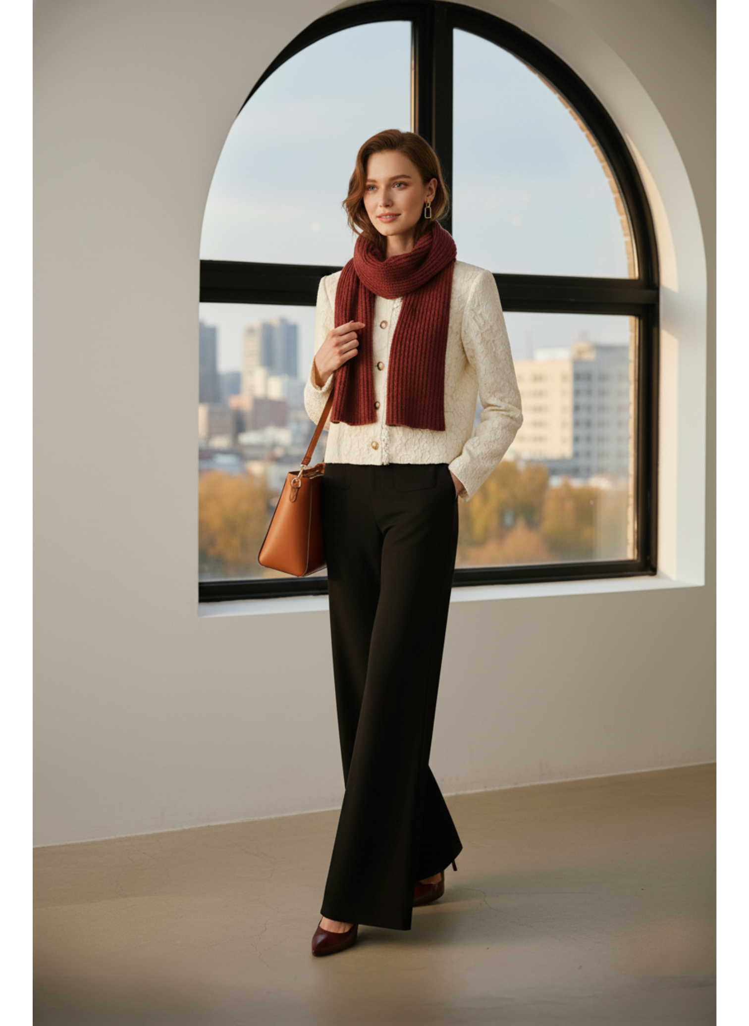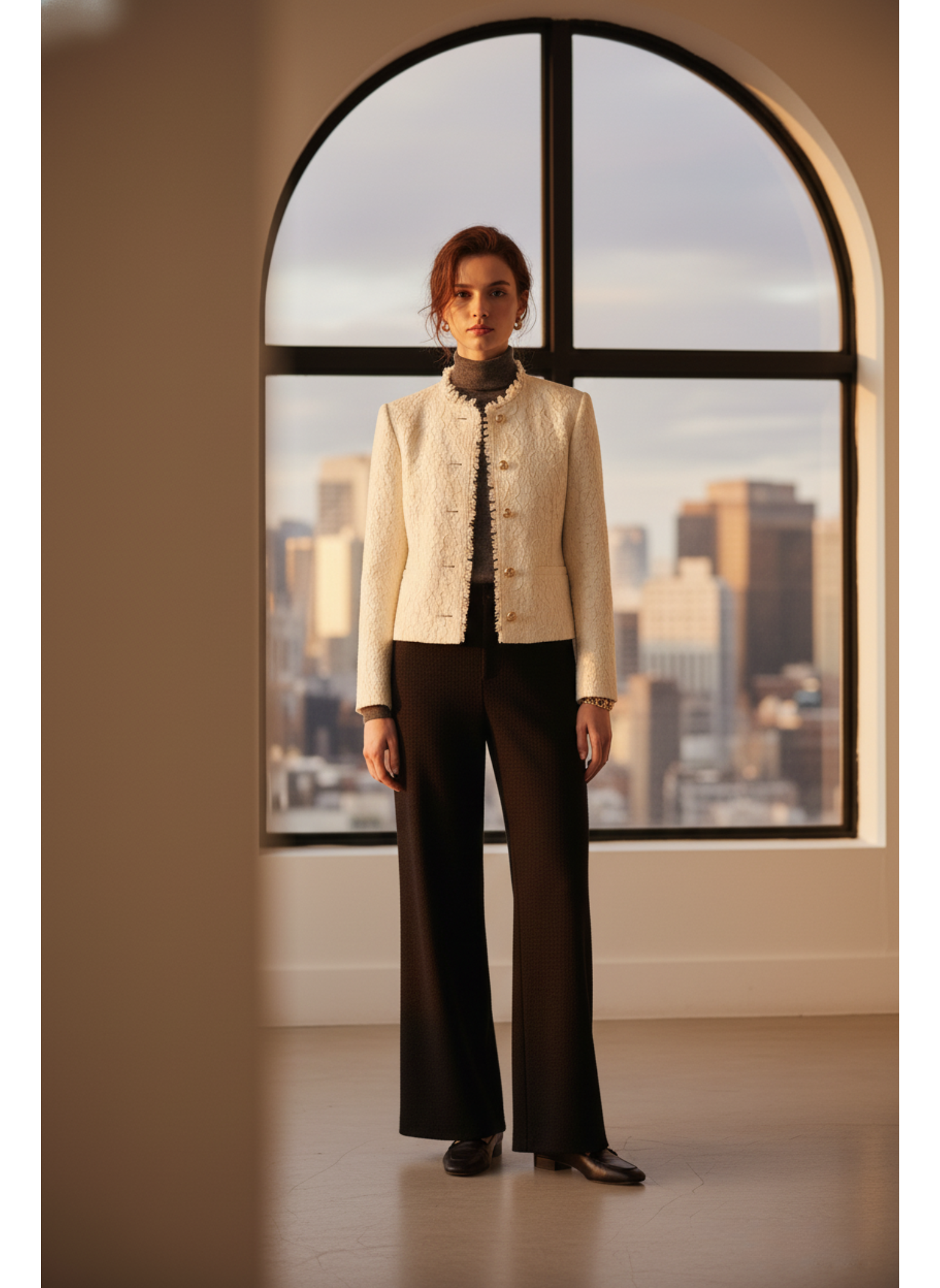 Quietly polished and feminine, this jacket refines everyday tailoring with a lace-textured surface and a hip-skimming, cropped proportion. A round, collarless neckline edged with delicate fringed trim frames the face, while sculpted shoulders and pearl-like buttons keep the line clean and composed—equally elegant with the matching skirt or sleek trousers.